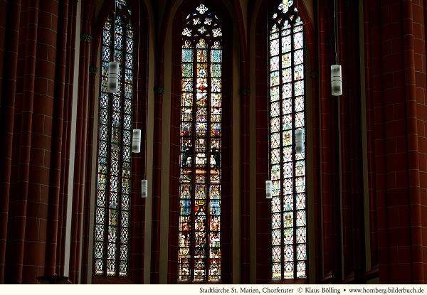 Die Chorfenster wurden1893 gestiftet. Das Mittlere ist das Reformationsfenster mit Szenen, die an das Ereignis im Jahr 1526 erinnern.