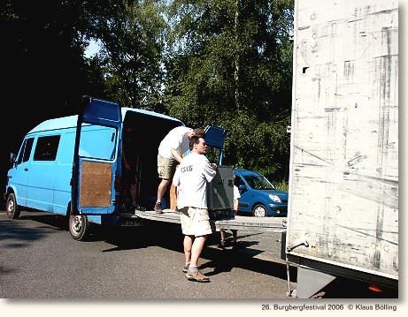 Logistik ist am Burgberg alles. Die Anlage muss am Fuß des Berges umgeladen und in Transportern hinaufgeschafft werden. Viel Arbeit für ein Festival an einem ausgefallenen Veranstaltungsort.