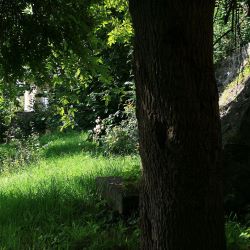 die Zeit nehmen, auf der steinernen Bank unter Bäumen und rankenden